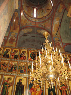 Наибольший интерес с художественно-исторической точки зрения представляет верхний храм, куда ведет широкая лестница, восстановленная на месте снесенной в 1960-х годах поздней колокольни, не простоявшей и века. Когда-то фрески покрывали стены храма, его своды и столпы сплошным цветным ковром; позже они были частично записаны сверху масляной живописью; ныне оттого ковра остались лишь фрагменты — но довольно значительные.